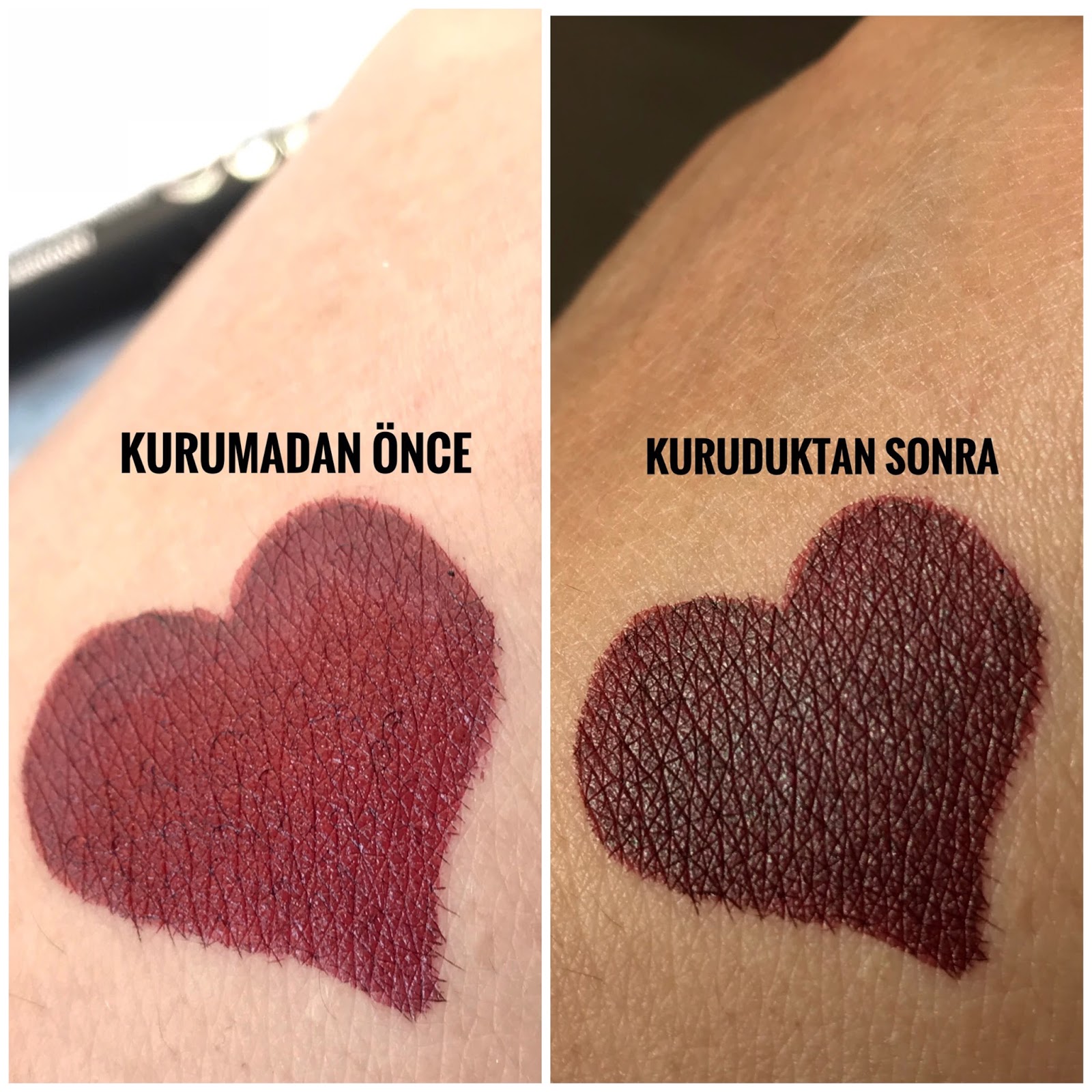 elimin üzerinde burdada size göstermek istedim kurumadan önce vişne çürüğü gibi ardından matlaşığ bordolaşıyor ama çıkarınca sağ taraftaki gibi dudaklarınız bu renk kalıyor 🙂 bu ürünün fiyatı ise 24.90 tl